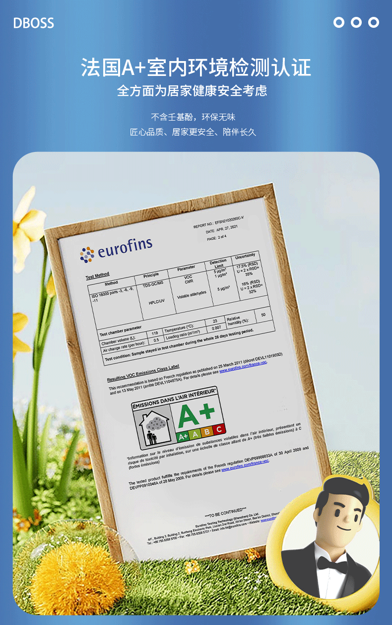 產品承諾:通過法國室內環境檢測A+認證 歐盟SGS、CE環保產品認證